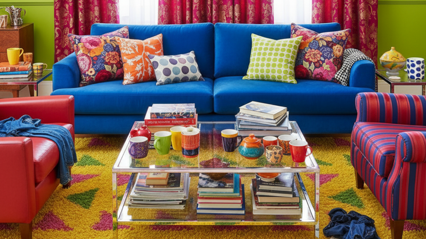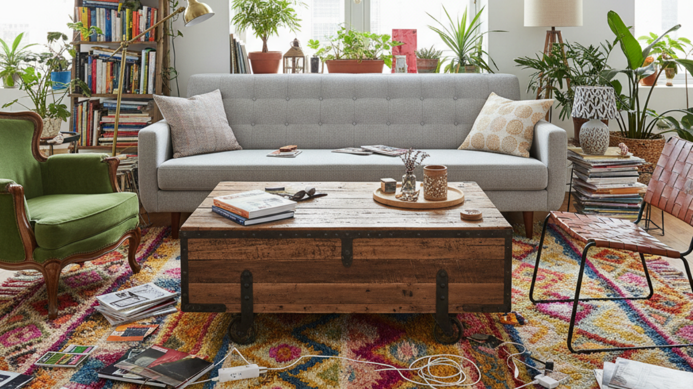 Mixing too many styles, like pairing a modern sofa with a rustic coffee table, can make a room feel chaotic instead of curated.