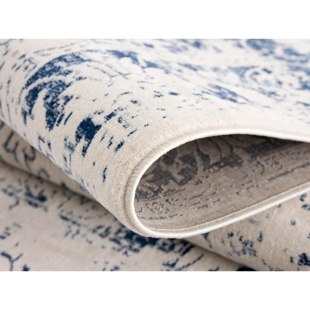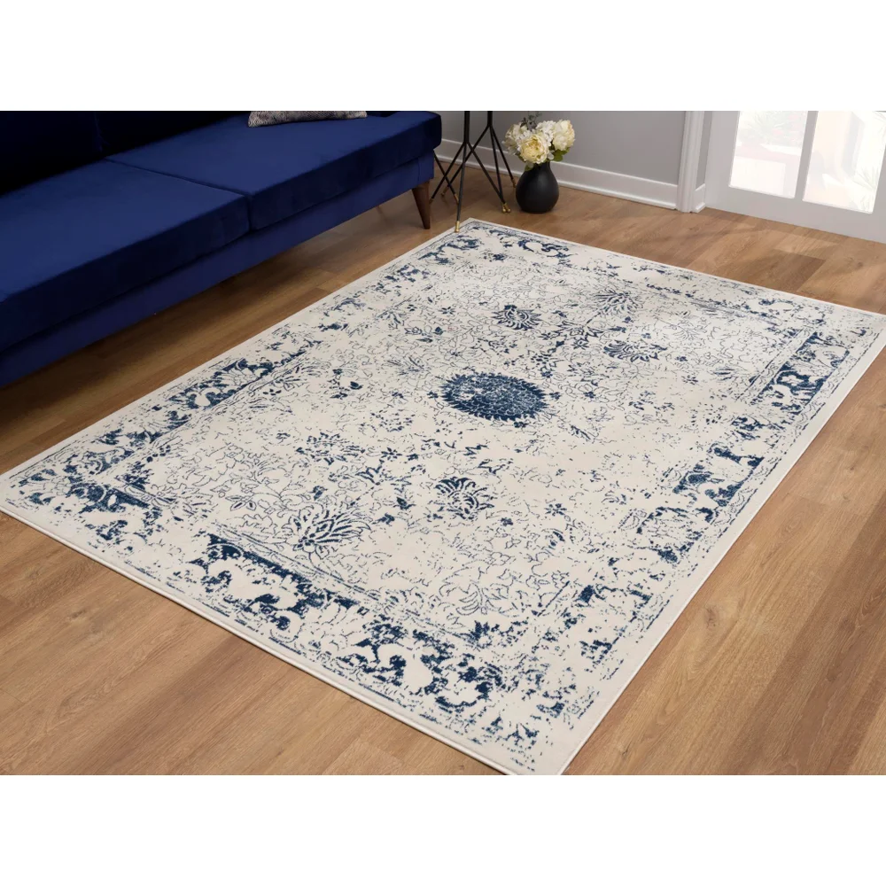 Featuring a distressed Persian medallion pattern, this rug draws from centuries of traditional textile artistry — reimagined for the modern home. The deep navy blue detailing is rich without being overpowering, and the deliberately faded, vintage-washed finish gives the rug a sense of history and warmth the moment it hits your floor. The ivory background keeps things feeling light and airy, making it a versatile choice even in smaller spaces.