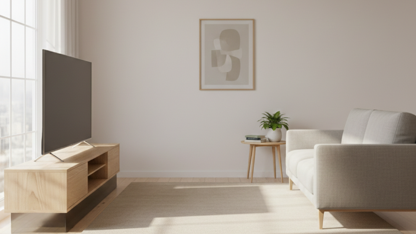 Solid blocks under a TV anchor the room too heavily. Open-base designs maintain visual flow and prevent the space from feeling bottom-heavy.