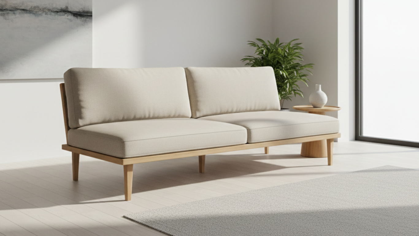 Furniture that lifts off the floor creates visual breathing room. Sofas with slim, visible legs allow light to pass underneath, making the room feel more open than bulky, floor hugging couches.